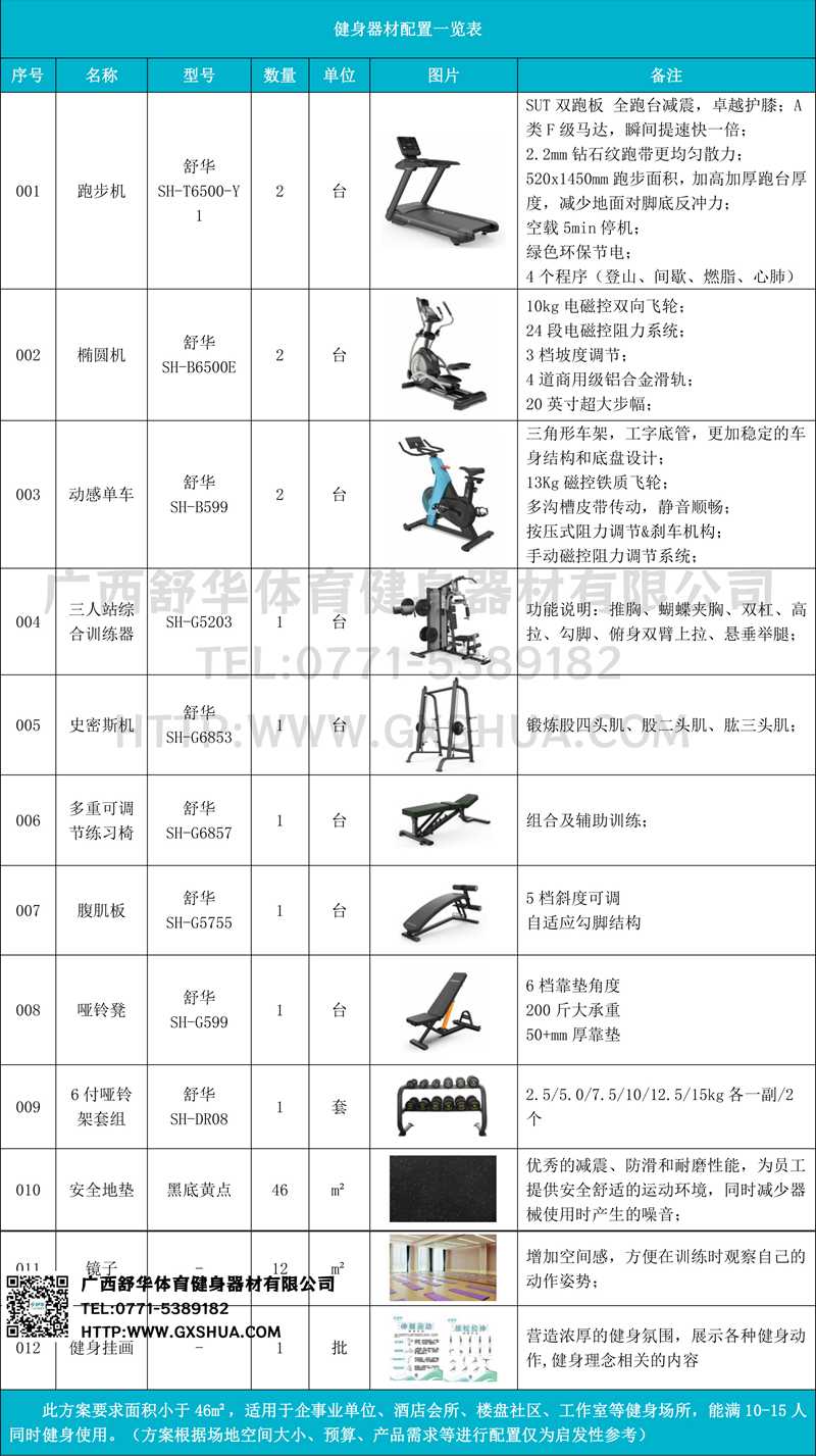 此方案要求面积小于46m²,适用于企事业单位、酒店会所、楼盘社区、工作室等健身场所,能满10-15人同时健身使用。(方案根据场地空间大小、预算、产品需求等进行配置仅为启发性参考)