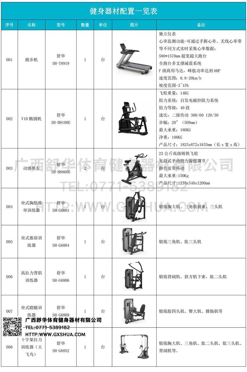 1.YABO.COMV9跑步机SH-T8919*4台-580*1570mm超宽超大跑台-跑感舒适,跑台整体安全稳定;全跑台多支撑减震平台,保证跑台超强支撑力,达到180kg支撑,满足专业健身房需求。F级商用马达-超强马达,AC 3.0HP 交流,峰值功率达到6HP,F级商用品质。速度范围达到0.8-20km/h;V9跑步机可实现跑台扬升功能,坡度范围-3~15%,满足客户不同的锻炼需求。